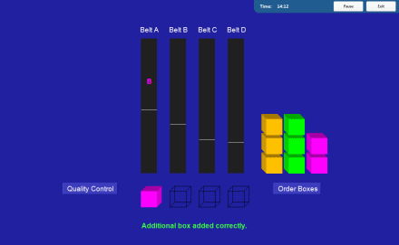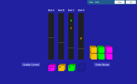 The primary task is to pick up letters from the conveyor belts of the assembly line and place them into boxes of the corresponding color, while each box can accommodate four letters and has to be loaded with one A, one B, one C and one D. Primary task of Letter Factory Test is complemented by several subtasks test takers have to consider in their planning (e.g. box logistics and quality control).