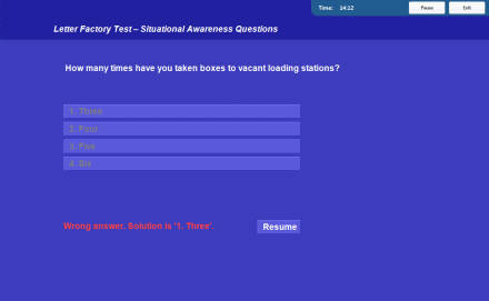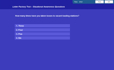 Situational awareness, planning ahead and decision making are the aptitudes measured in Letter Factory Test. Participants are presented with a factory assembly line environment. The factory produces the letters A, B, C and D in different colors.